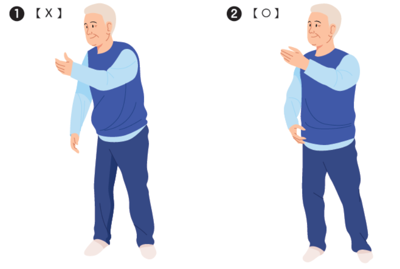 ① 몸통을 구부리지 않고 바르게 서도록 합니다(그림 1, 2).