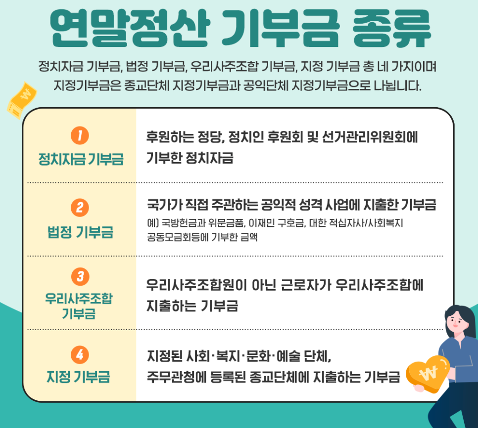 - 법정기부금: 사회복지공동모금회(사랑의 열매), 아동·장애인 복지시설 등 국가가 인정하는 공익 성격이 강한 기부금