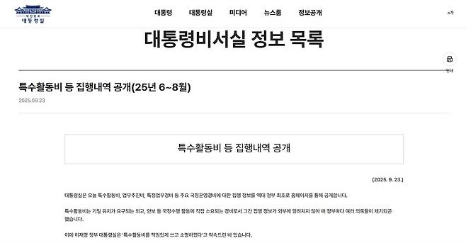 이재명 대통령실이 지난 6월부터 8월까지 사용한 특수활동비·업무추진비·특정업무경비 집행 내역을 23일 공개했다.