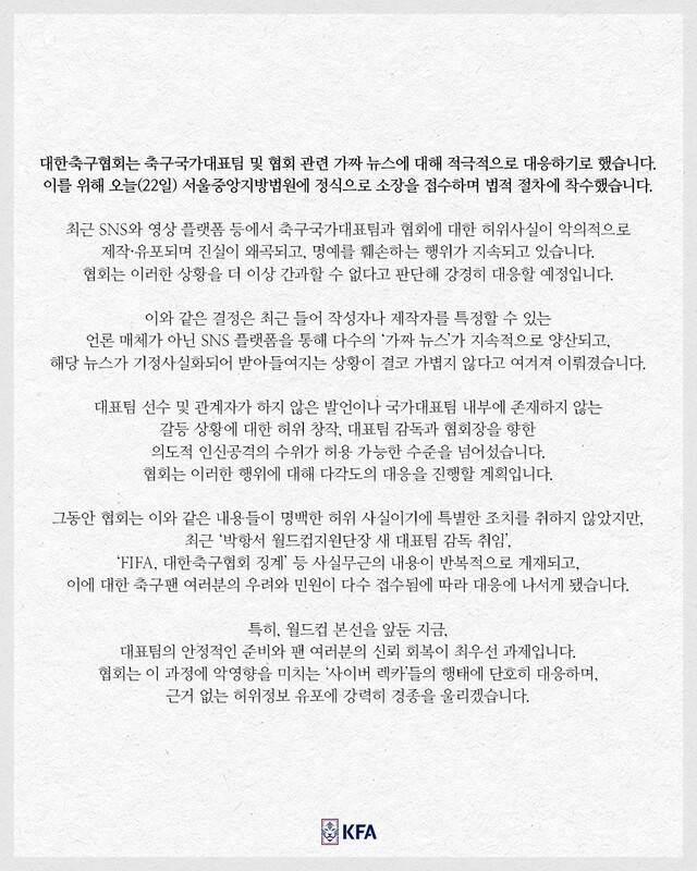 이에 따라 대한축구협회는 허위사실을 유포한 개인뿐 아니라,