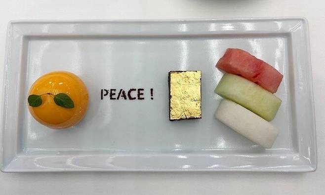 - 접시 위에는 평화를 뜻하는 영어 단어 ‘PEACE!’가 세련되게 새겨져 있었다.