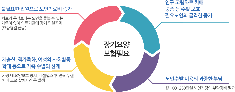 우리나라의 노인 인구는 2025년 전체의 약 25%에 달할 것으로 예상돼, 장기요양 재정 부담이 지속적으로 늘고 있는 상황이다.